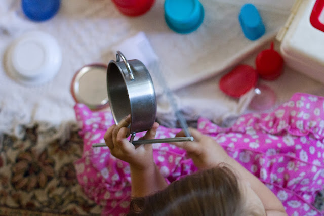 The big mess in the middle of the floor is our drums. For me, I have twenty drums. For Marilla, she has nine drums. For Keturah she has ten drums. The drums are kitchen toys. We have metal ones, plastic ones, pots and pans, plates and bowls, and we use for sticks the long gray K'nex.